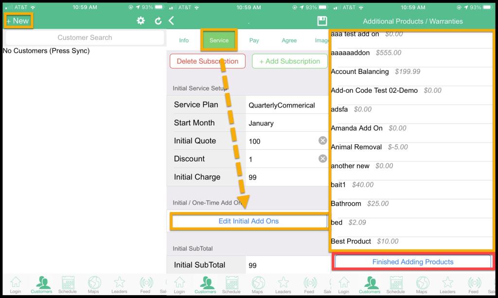 Go to the New Customer > Service tab > Edit Initial Add-ons to apply an Add-on in PestRoutes Sales.