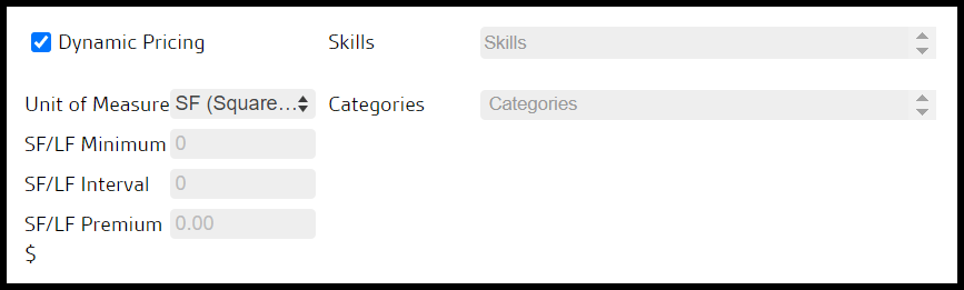 Dynamic Pricing: When enabled, allows for pricing to be calculated based on a measurement and includes options for square feet (SF) and linear feet (LF) (For more information on this feature, see the Dynamic Pricing: Pricing by Measurement user guide.)