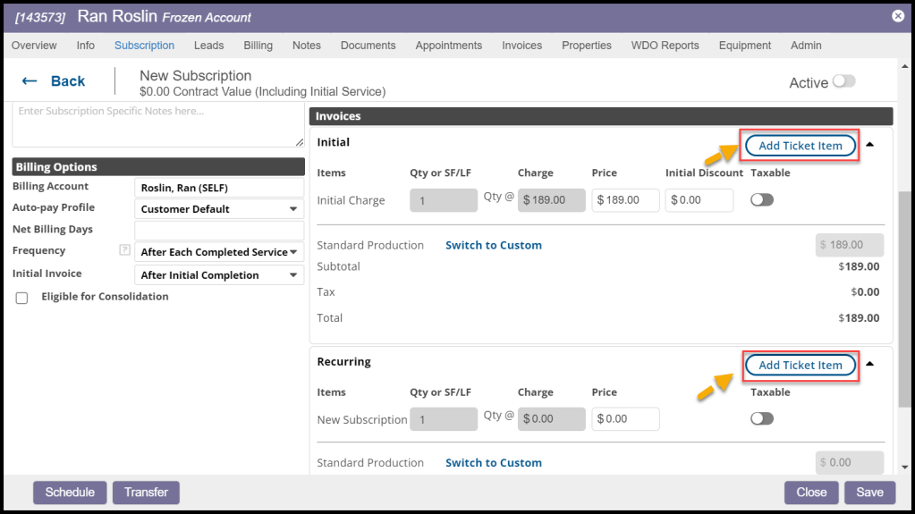 Customers > Customer Card > Subscription tab > select the desired Subscription > Invoices section > + Add Ticket Item.