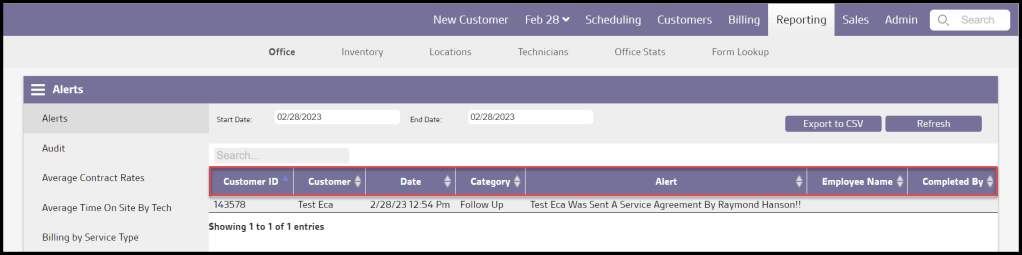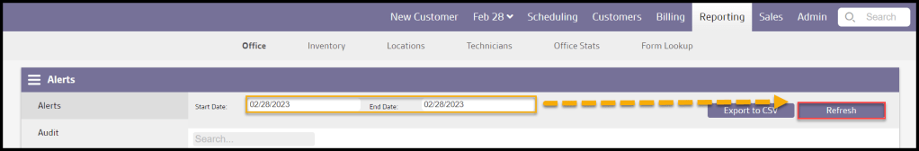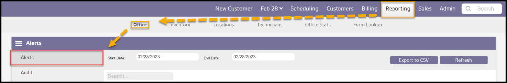 Alerts help keep track of incoming information regarding customers. There are six different types of alerts: Customer Feedback, Technician Flags, Scheduling, Follow Up, Reminder Reply, and SMS Reply. The Alerts report is an easy way to view all office alerts within a specific date range.