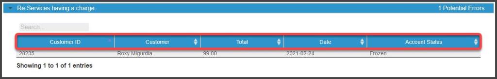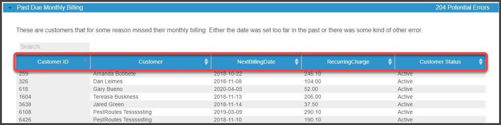 This section displays customers that missed the payment on their monthly billing. This can happen if their next Billing Date was set in the past, or there was some other kind of error. To correct this error, set the Billing Date to a current date or a date in the future. Remember, the actual service dates are not factored into this, the system will only take into account the monthly Billing Date.