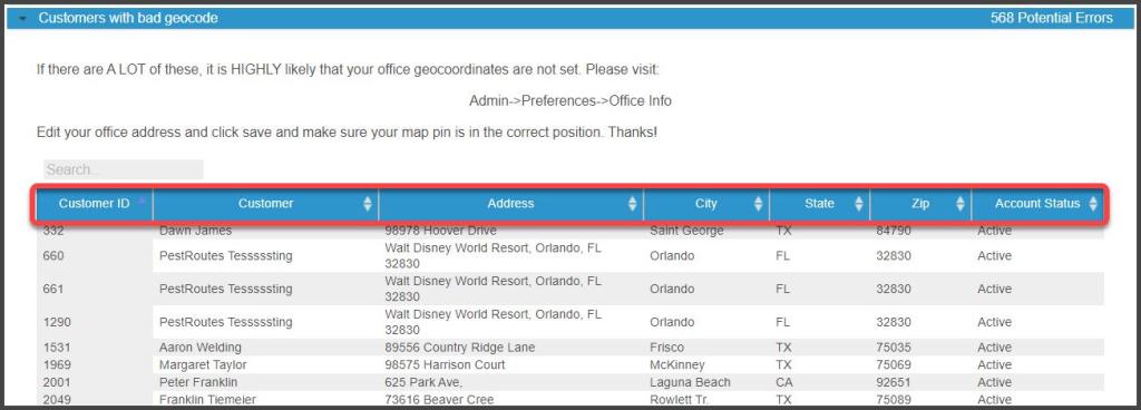 Customers with “bad geocodes” have something wrong with their address, causing mapping software to struggle or fail to find it on their map. It could be that the address is non-existent, misspelled, missing the correct zip code, etc. First, make sure that the customer’s address is typed correctly in the Customer Card, then make sure the office has been geolocated correctly. If the geocode for the office is off, then this will affect the customers.