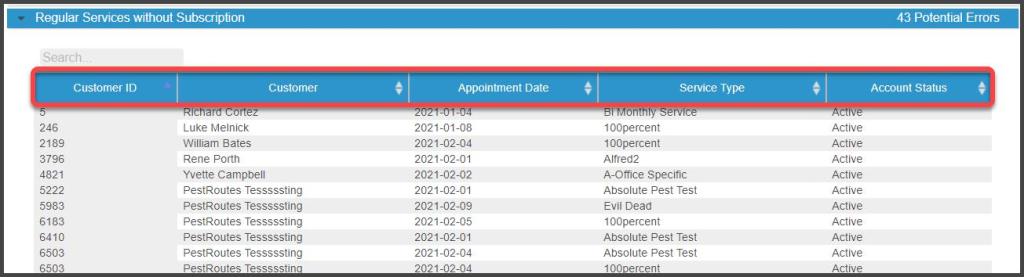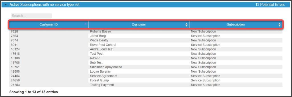 This section detects customers with active subscriptions that have no Service Type selected for that subscription. To correct this issue, select the customer’s name on the report to open the customer card and go to the Subscriptions tab, select the proper service type under the Recurring Services column, and save the Customer Card.
