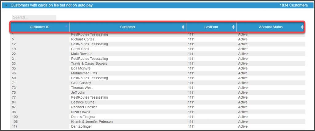 This section shows customers with a payment card on file but not on AutoPay. To fix this, open the Customer Card and go to the Billing tab and turn AutoPay on.