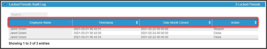 This section shows a date/time stamp and employee record for each case of the accounting period being locked or unlocked in the Admin > Preferences > Office Settings > Preferences > Month Closing section.