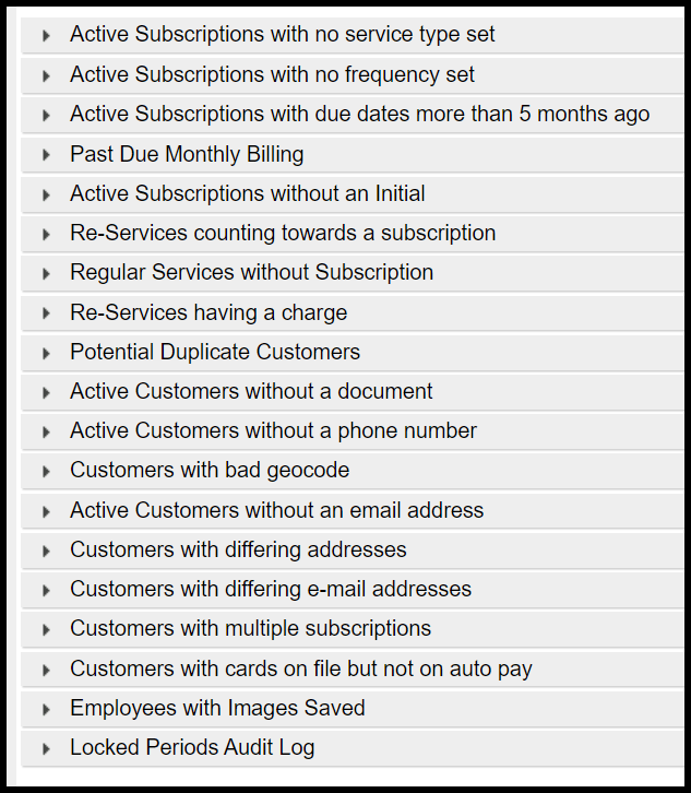 The Audit report is actually an aggregate of a number of lists that allow various items or customers to be tracked and corrected. Click on the triangular toggle next to the title to select a list to review. The tabs available are as follows: