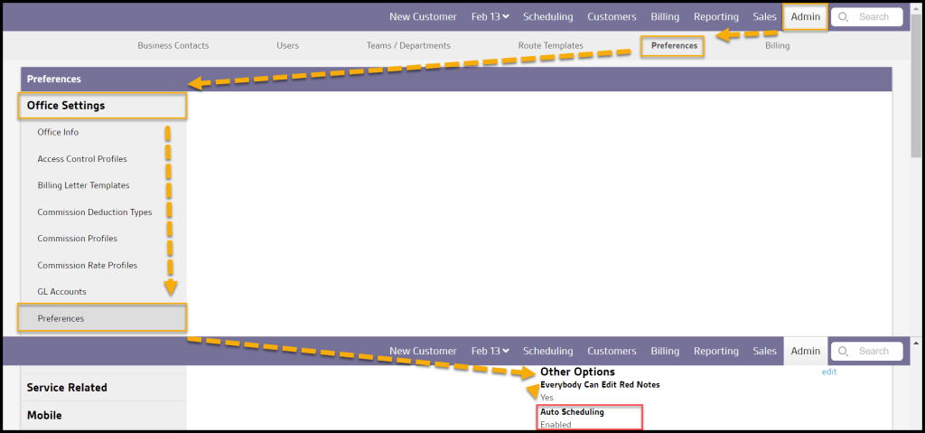 To enable Auto Schedule customers, navigate to Admin > Preferences > Preferences > Other Options.