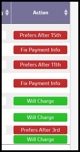 A single account may have more than one Action Status, such as the sixth example below that has both a Max Monthly Charge that was reached ( thus a “Monthly Reached” status) and also a Preferred Billing Date = 27th (shown as “Prefers after 27th”). Action Status may be manually updated by clicking the button and rotating through the options possible for that account.