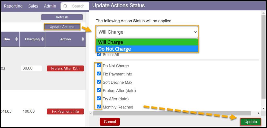 The bulk update will change all statuses to Will Charge by default, but the drop-down menu may be used to change the update action to Do Not Charge if so desired.