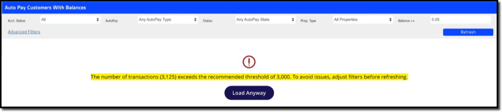 If the number of records generated by the AutoPay Balances batch pay tool exceeds 3,000, performance issues or errors may result. In this case, the system posts the following warning, suggesting the user apply some filters before loading/refreshing.