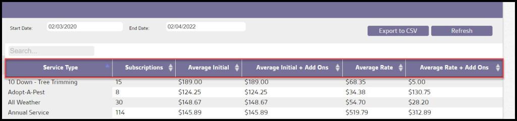 The Average Contract Rates report calculates the average value of the initials and recurring charges for each of the user’s service types within the specified date range. There are six important data columns in this report: