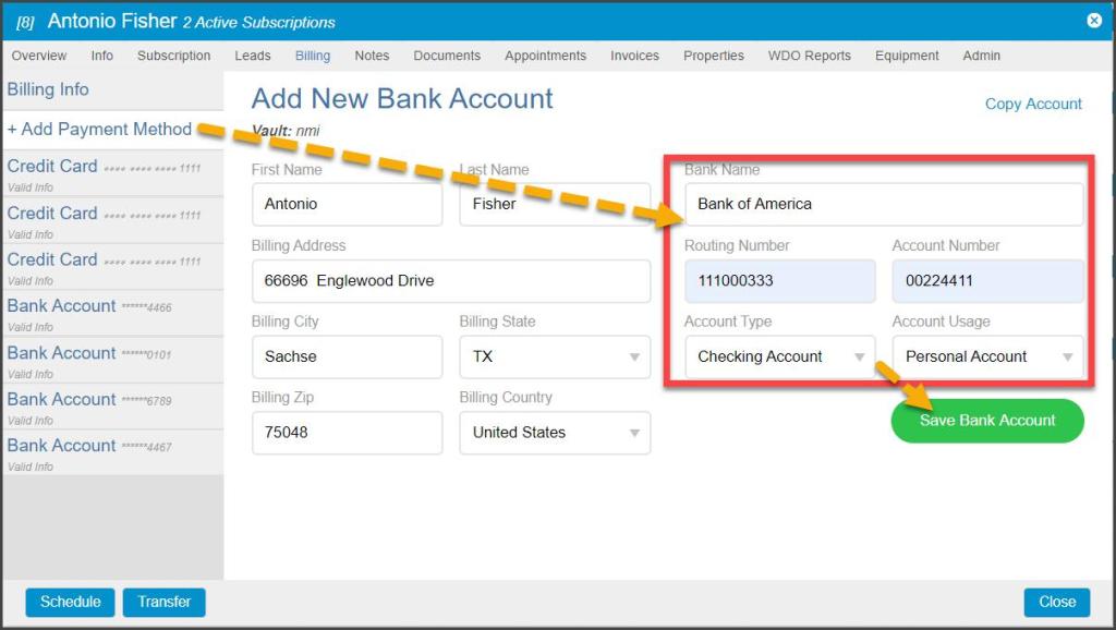 This option is available when adding ACH bank account payment methods as well. Consult the Copy Billing Account user guide for complete details on this option.