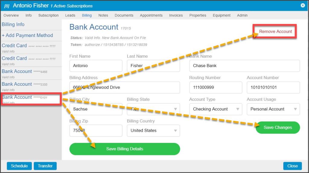 The bank account is flagged in the Customer Card > Billing tab