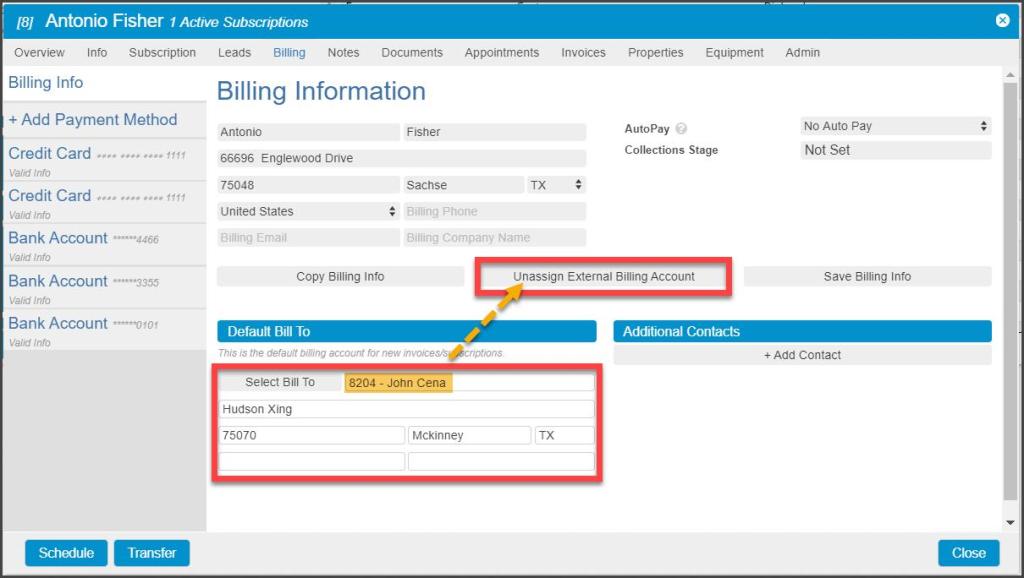 If the External Billing Account choice needs to be rolled back, the Assign New Billing button has now become an Unassign External Billing Account button, and selecting this will restore the Default Bill To information to its original state.