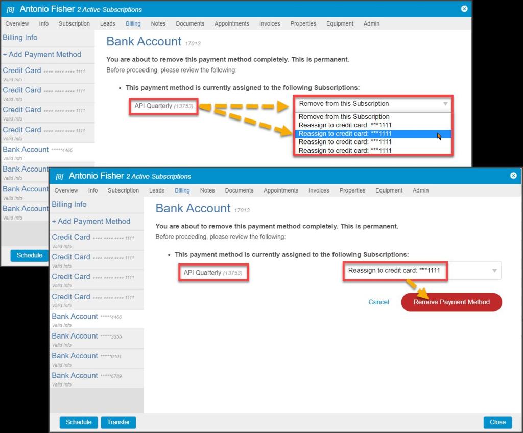 - Reassign to credit card/ACH: A new payment source for the Subscriptions may be chosen from all other valid payment methods on file.
