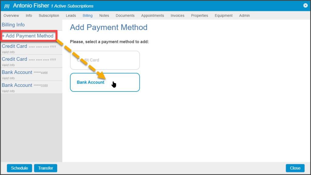 To add an ACH bank account payment method, +Add Payment Method > Bank Account.