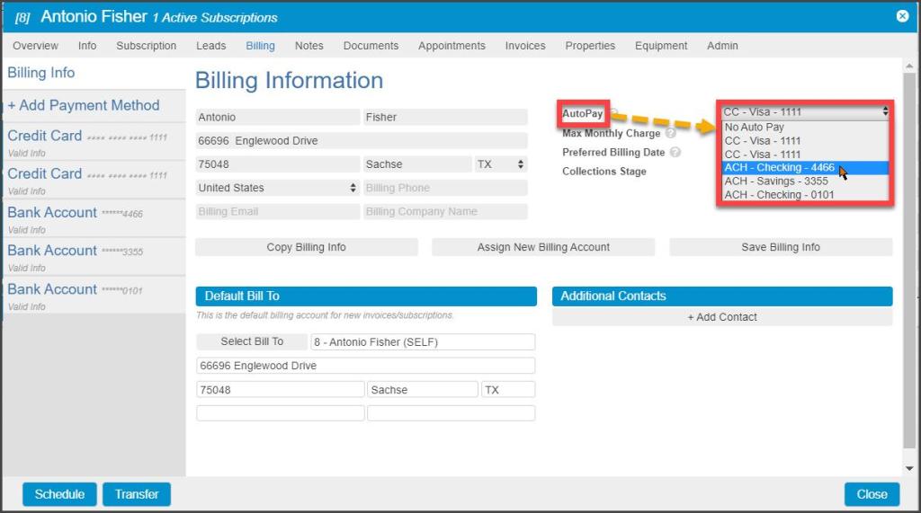 The Best Service plan, but a large termite treatment needs to AutoPay via ACH from a savings account. That second termite Subscription can be set to AutoPay from a different source than the Default in the Subscription Billing Options.