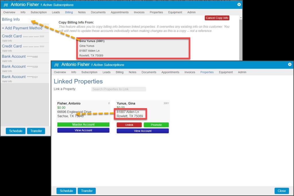 Click on any Linked Properties to copy the Billing Information from that Customer Card into the current one.