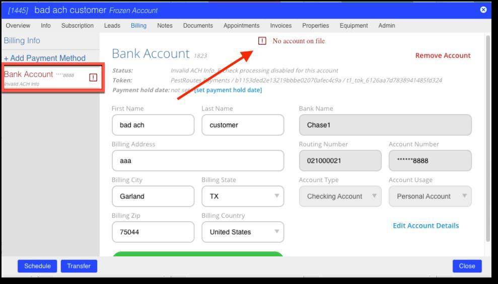 Second, the related bank account in the Customer Card > Billing tab will be highlighted in red and a message at the top of the page will indicate what issue has caused the ACH return (see message list below).
