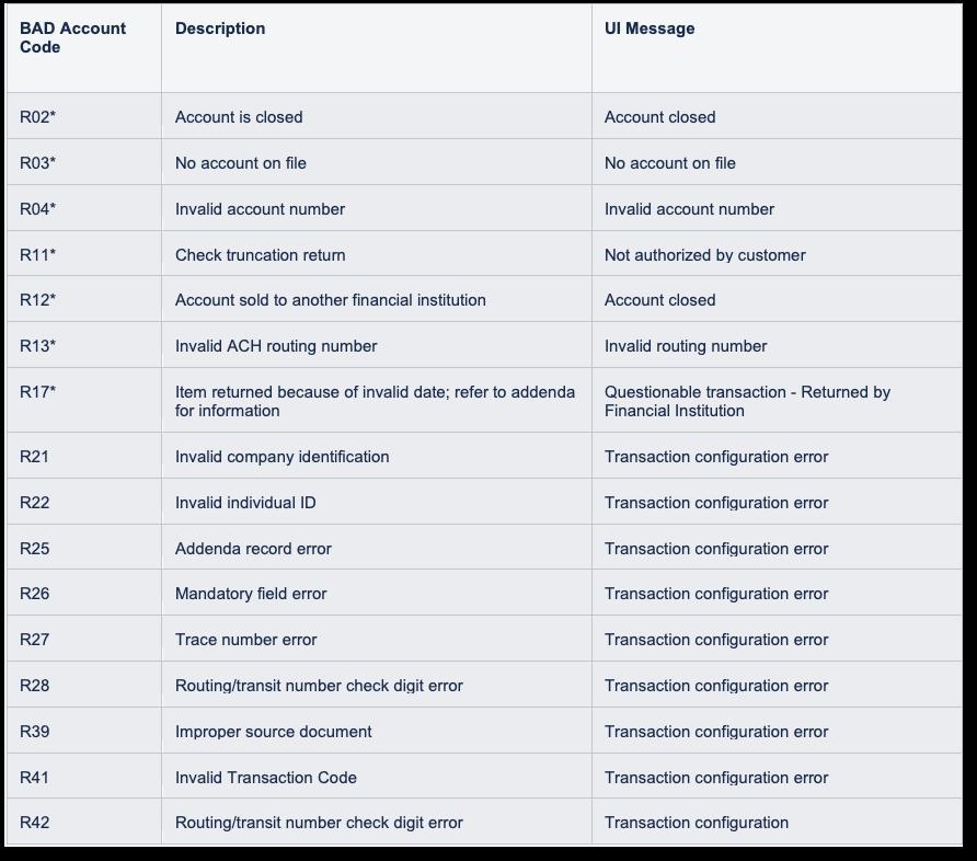 The following reasons may be displayed for the ACH Return:
