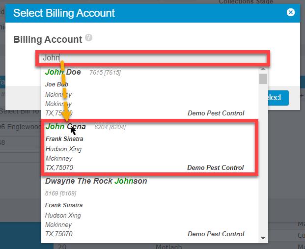Selecting the Assign New Billing Account button brings up a search window. Type in the name of any existing customers and highlight them in the list.