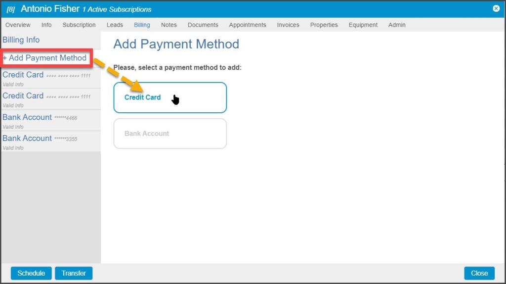 To add a new credit card to a customer’s account, select the +Add Payment Method tab and choose Credit Card to select the MOP type to be added.