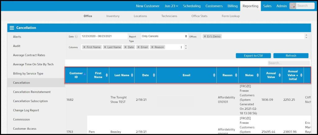 - Notes: Any cancellation notes added by an office user when the customer was canceled.