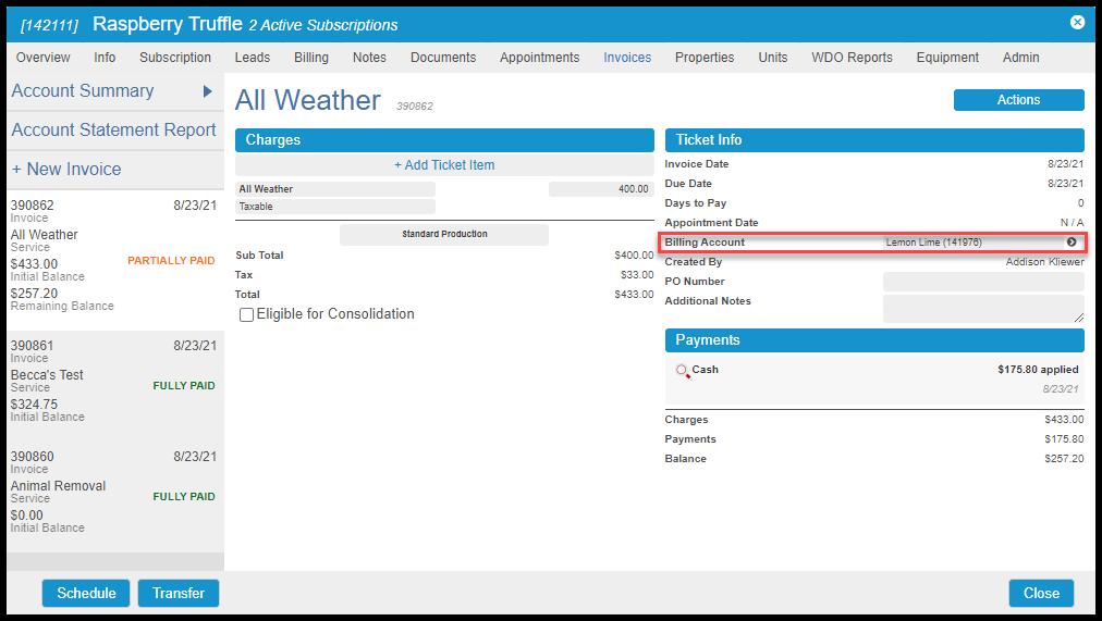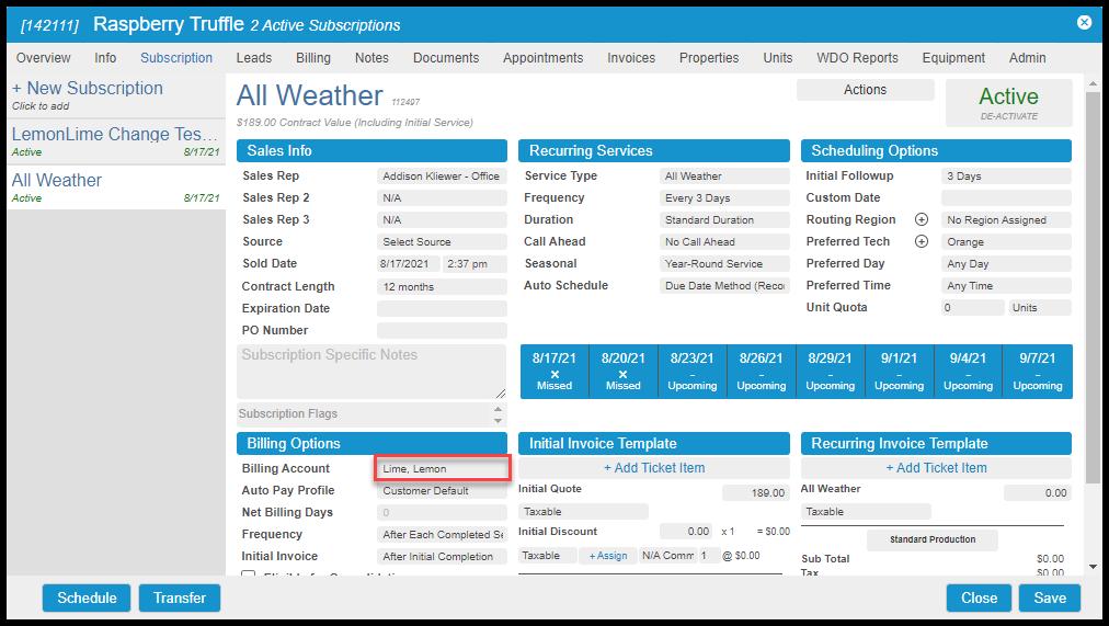 The user can now set the default billing account under the Billing Account options of the subscription. If a customer’s default bill to is already set, this will pre-populate with that default account. The user can set each subscription to a different Billing Account. By default, each invoice created will be linked to and added to the “Responsible Balance” of the “Billing Account” chosen.