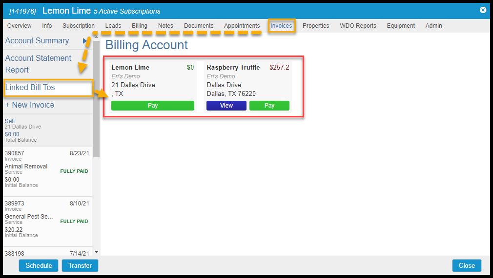 The Invoices tab will also show all the accounts and invoices linked to that customer card. Within the Linked Bill Tos section, the user can also pay or view each account.
