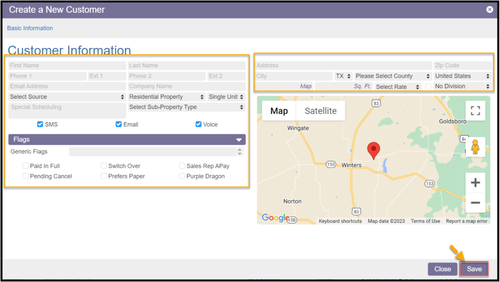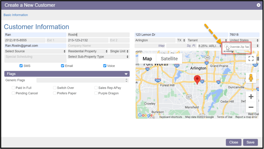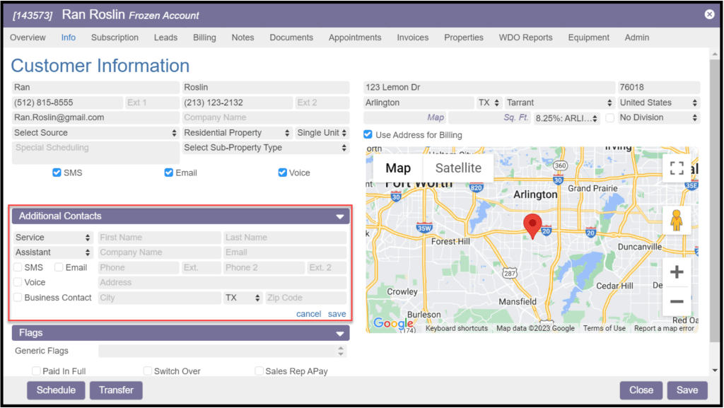 Several additional fields appear at the bottom of the service address to help manager the Customer.