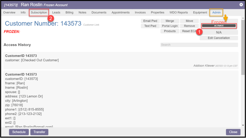 - In the Admin tab, the upper right corner has the option to Activate the customerr