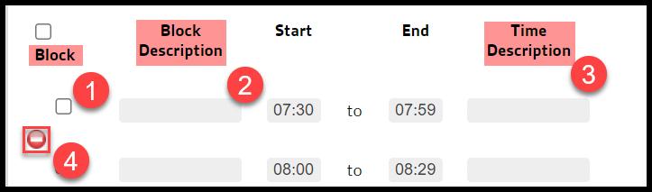 - The Block is checked for the 15:00 hour, but both Block Description and Time Description are blank = the normal Time remains, and the Block defaults to “Break.”