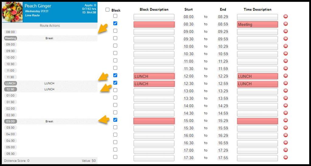 Select the checkbox to the left of the desired Block Description field(s) to block out time intervals on the Route by default. This blocks the designated timeslot for meetings, breaks, or lunch periods. The settings function as follows: