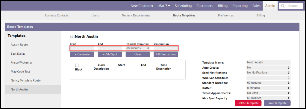 - Interval (minutes): This will determine the length of each time slot on the template. The best practice is to use the company’s standard appointment duration, such as 30 minutes.