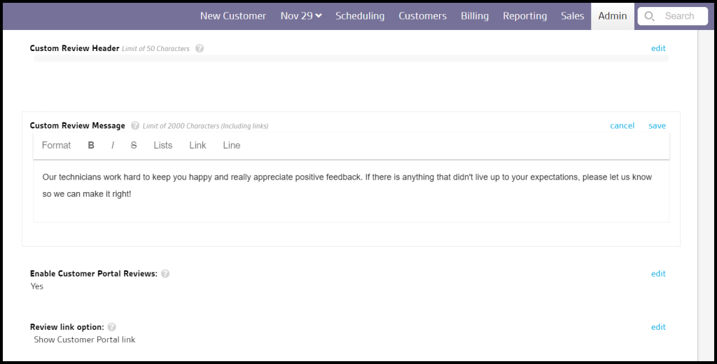 - Custom Review Message: Use this to customize the message that will appear in the “Let Us Know How We Did” section of the service followup-emails.