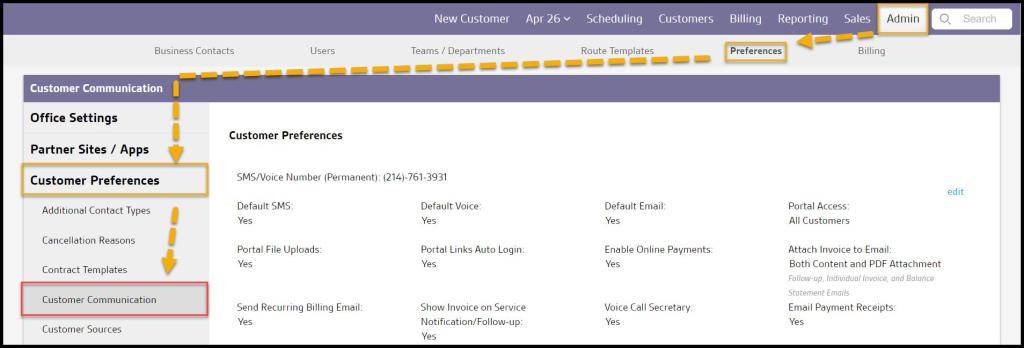 The Customer Preferences section allows users to configure communication settings that will apply to all customers, such as SMS and voice message time windows, enabling online payments and recurring billing emails.