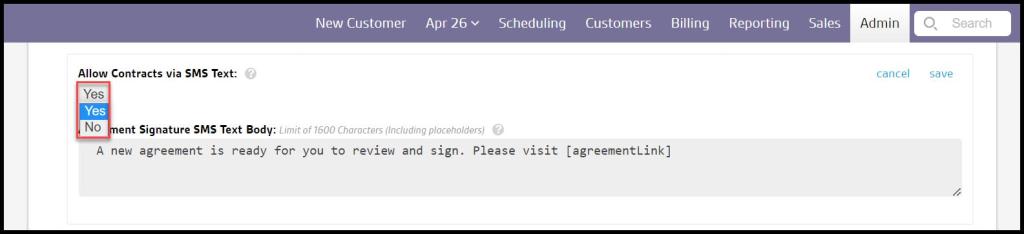 In addition to emails, SMS text messages may also be enabled to send a Customer Portal link inviting customers who receive SMS communication to provide an electronic signature authorization on contracts. When set to Yes, this preference provides the option on the Customer Card > Documents > Request Customer Signature action; the Send SMS option will appear in the drop-down menu.