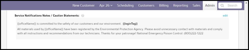 Anything in the Service Notification Notes / Caution Statement field will display at the bottom of the completed service notification customers receive when a service is completed.