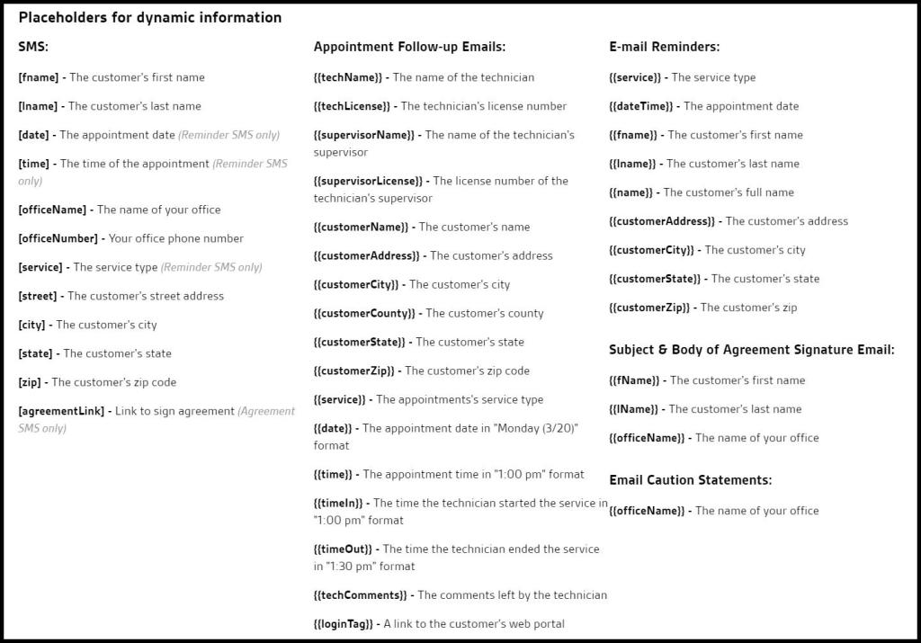 These dynamic placeholders will only work within the Customer Communications preference, and the user can only use the placeholders specific to the related communications. For example, all the SMS placeholders can only be used for SMS appointment reminders.