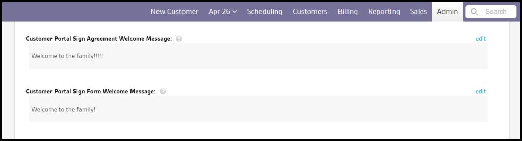 The Customer Portal Sign Agreement Welcome Message appears when a customer logs into the customer portal using the company’s PestPortals URL. The user can customize this field.