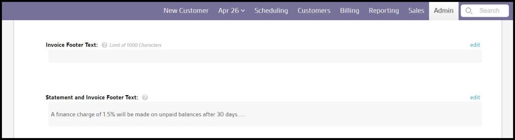 The Invoice and Statement Footer Text fields allow users to apply a default note to the invoices and account statements sent to customers.