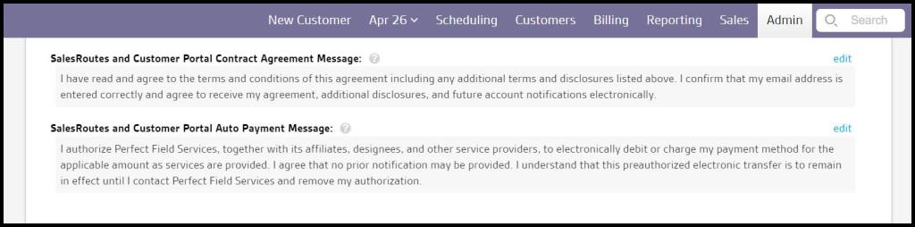 Mobile Sales and Customer Portal Auto Payment Message: This appears at the bottom of the “Agree” tab on the Mobile Sales apps, and the Customer Portal above the auto pay authorization initial field when signing a contract. If left blank, this will default to “I authorize (CompanyName) to automatically apply each charge stipulated in this agreement to my credit/debit account listed above.”