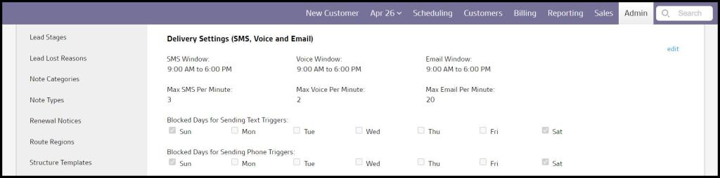 These settings have several important features. The user can control customer access in the Customer Portal, the accounts receivable hold time, and create templates for all SMS, email, and voice appointment reminders the user can send to customers via our software.