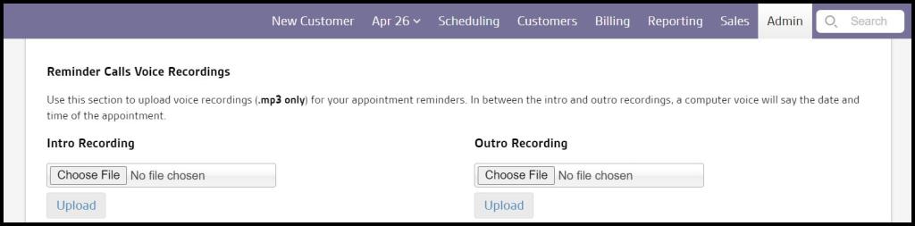 If the user would like to upload a voice appointment reminder, the user will have to record an intro and outro. In between the intro and outro recordings, a computer voice will automatically say the date and time of the appointment.