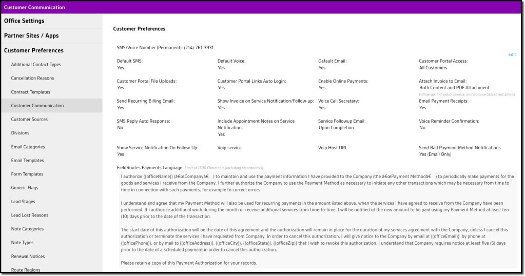 - FieldRoutes Payment Language: Default language that appears on service agreements and payments to protect the C1 customer in payment disputes with C2 customers. This default language may be edited if desired.