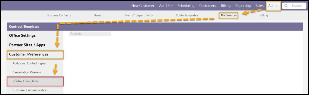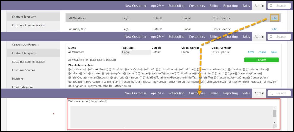Admin > Preferences > Customer Preferences > Contract Templates > Open a contract template > Welcome Letter.