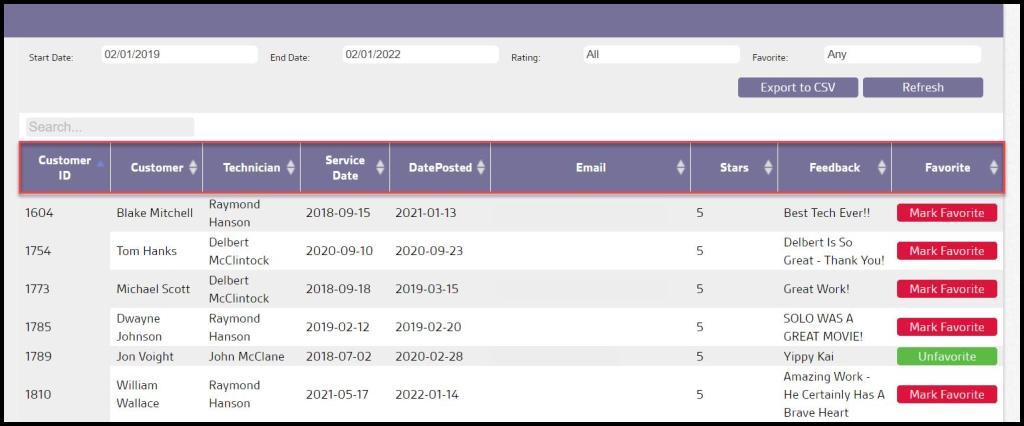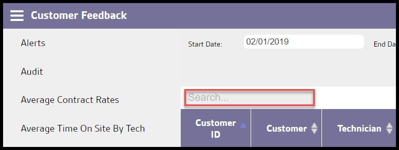 The Customer Feedback Report shows all of the feedback left on the Customer Portal after the customer has been serviced. It can run the report based on date range and be filtered by the number of stars the customer rated their service. This report showcases the feedback customers leave after they’ve been serviced. It can be searched using a date range and utilizing the search bar to find specific information.