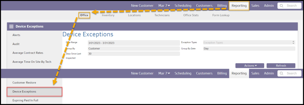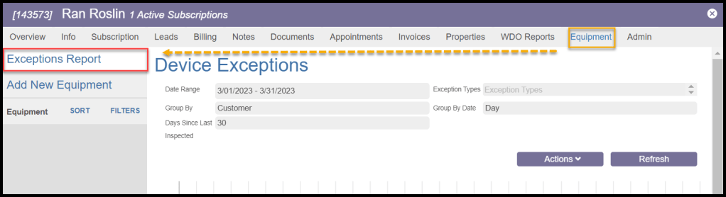 The Exceptions Report in the Customer Card shows Device Exceptions for that particular customer of that customer card. For more information, please see The Customer Card: Equipment Tab (Exceptions Report) guide.