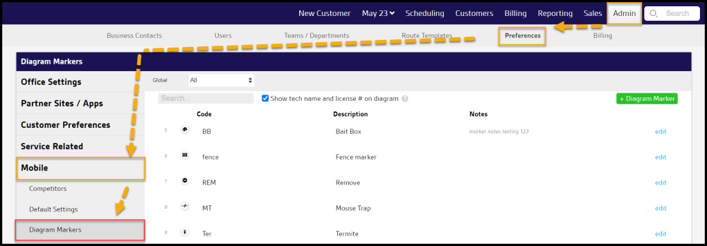 The Diagram Markers preference is for creating and managing the diagram markers available in the Diagramming Tool. The Diagram Markers allow the user to create custom codes that are shown on the diagram, as well as custom descriptions that are shown within the Diagram Legend (contact support for information on how to get a custom form made that allows the user to add the diagram image and legend (descriptions and square feet of the structures and the descriptions of the flags).