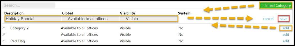 - Visibility: Hide or show Email Categories. The user cannot delete Email Categories, only hidden from being selected.